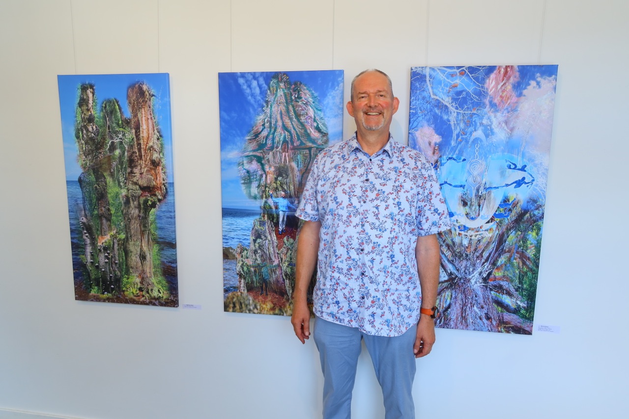 Wenn wir nun den Blick auf die ausgestellten Werke der Mitglieder der Künstlergruppe Waiblingen werfen und mit Diethart Verleger beginnen, dann werden wir feststellen, dass die Materialität, die „materia prima“, also der Stoff aus dem ein Kunstwerk ist, in seinem Werk wenig haptische Fühlsamkeit aufweist, als z.B. pastos aufgetragene Farbe, sondern entsprechend dem „Multi-Layer-Verfahren“ eine glatte Oberfläche besitzt, da seine Bilder am Computer generiert und im Zusammenhang mit ihm ausgedruckt und in einen stabilen Zustand gebracht worden sind.